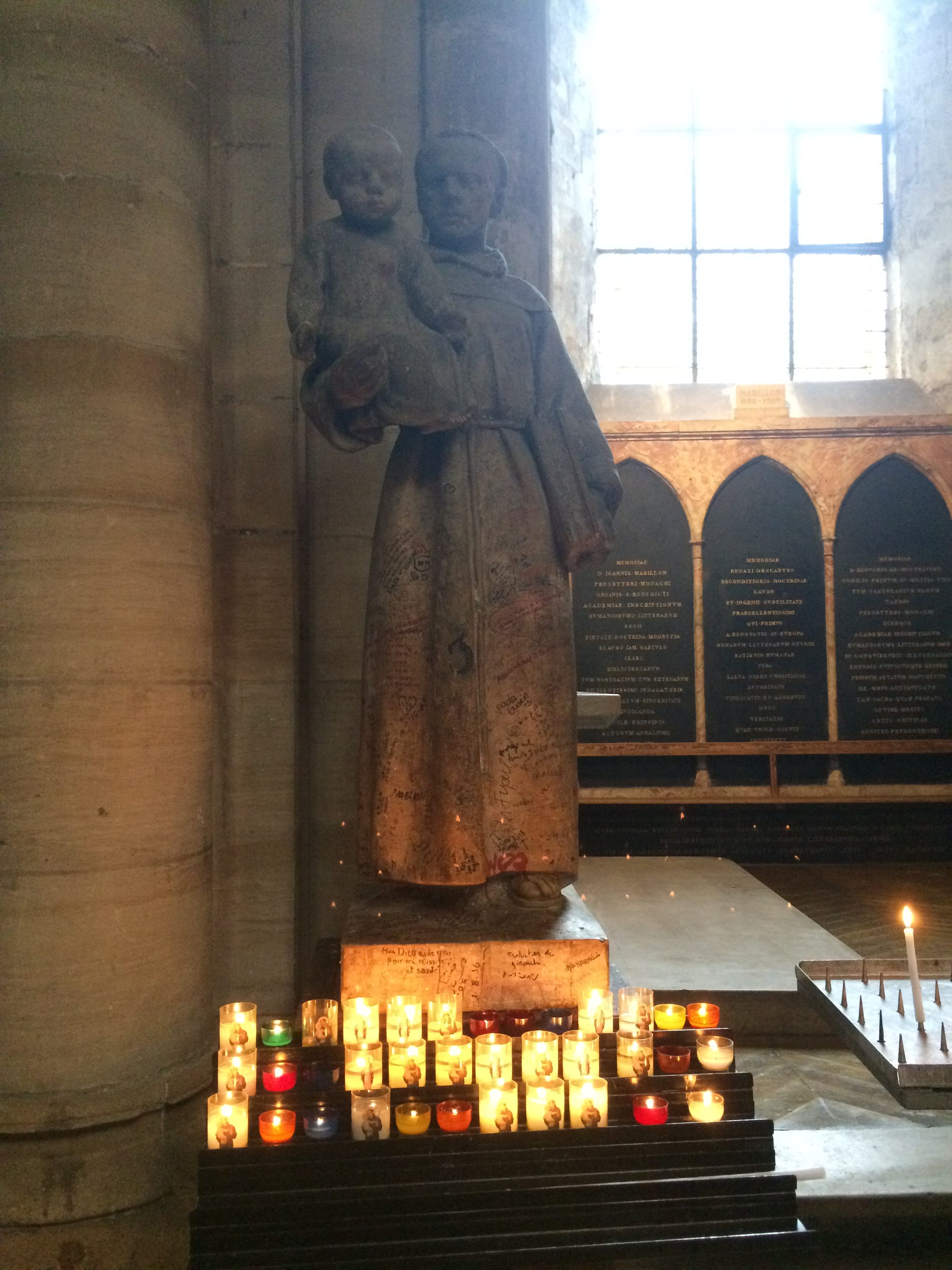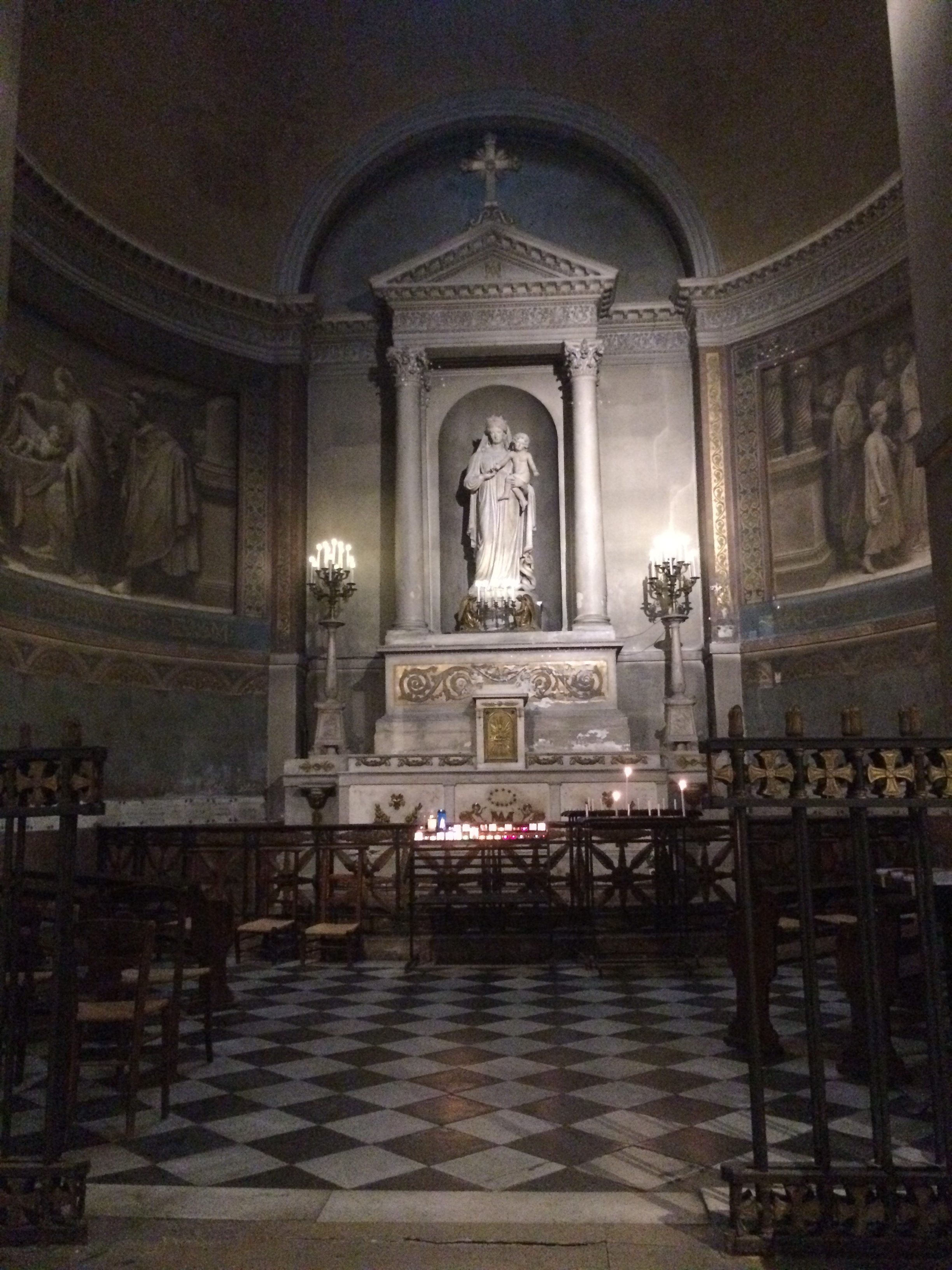 I noticed Saint Rita of Cascia (3rd row from the bottom, middle) and Saint Anthony of Padua (I think that’s an Anthony of Padua statue in the 4th row from the bottom, middle picture) were here too. Neither of these saints were French (both lived and died in Italy, though Saint Anthony was born in Portugal), so I wonder why devotion to these two seems to be common here in Paris. Saint Anthony is the patron saint of lost things, which would explain why he is common throughout the world, but I still don’t remember seeing him much back home. I didn’t know who Saint Rita was until last year, when I moved to Arlington and went to St. Rita Catholic Church in Alexandria, VA. She’s the patron saint of lost and impossible causes and abuse victims. Unfortunately, spousal abuse occurs worldwide, but I can’t think of anything tying her patronages or life to Paris in particular.